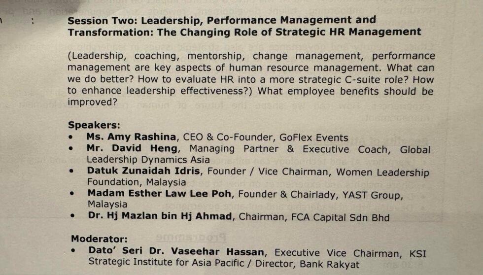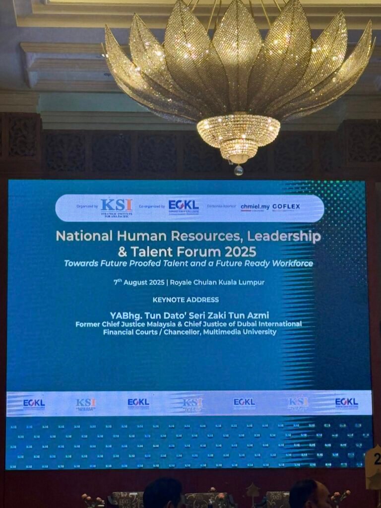 Our Founder Madam Esther Law Lee Poh extends her heartfelt gratitude to KSI (Strategic Institute for Asia Pacific) for the kind invitation to be part of the sharing session at the National Human Resources, Leadership & Talent 2025 – Towards Future-Proofed and Future-Ready Workforce Forum, held in Kuala Lumpur, Malaysia on 7th August 2025.